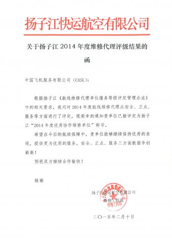 By demonstrating the professionalism, team spirit and concerted effort, the Line Maintenance Team of CASL has been awarded the “Outstanding Maintenance Partnering Organisation 2014” by Yangtze River Express.