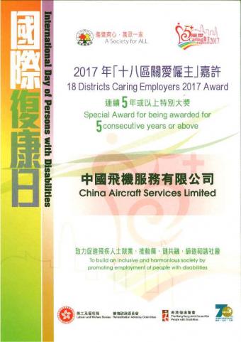 CASL provides equal employment opportunities and supports social integration of persons with disabilities and the able-bodied. CASL was presented the “18 Districts Caring Employer Award” and “Special Award for being awarded for 5 consecutive years or above” under the “18 Districts Caring Employers Scheme 2017”.