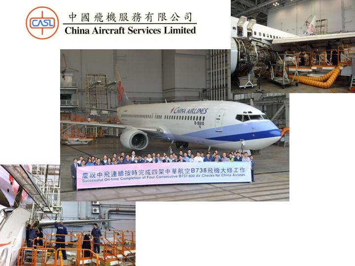 香港, 2011年11月25日- 中國飛機服務有限公司「中飛公司」近日宣佈,中飛公司在港成功為中華航空公司連續按時完成四架波音B737-800飛機AV13檢,讓飛機投入正常的航班營運。