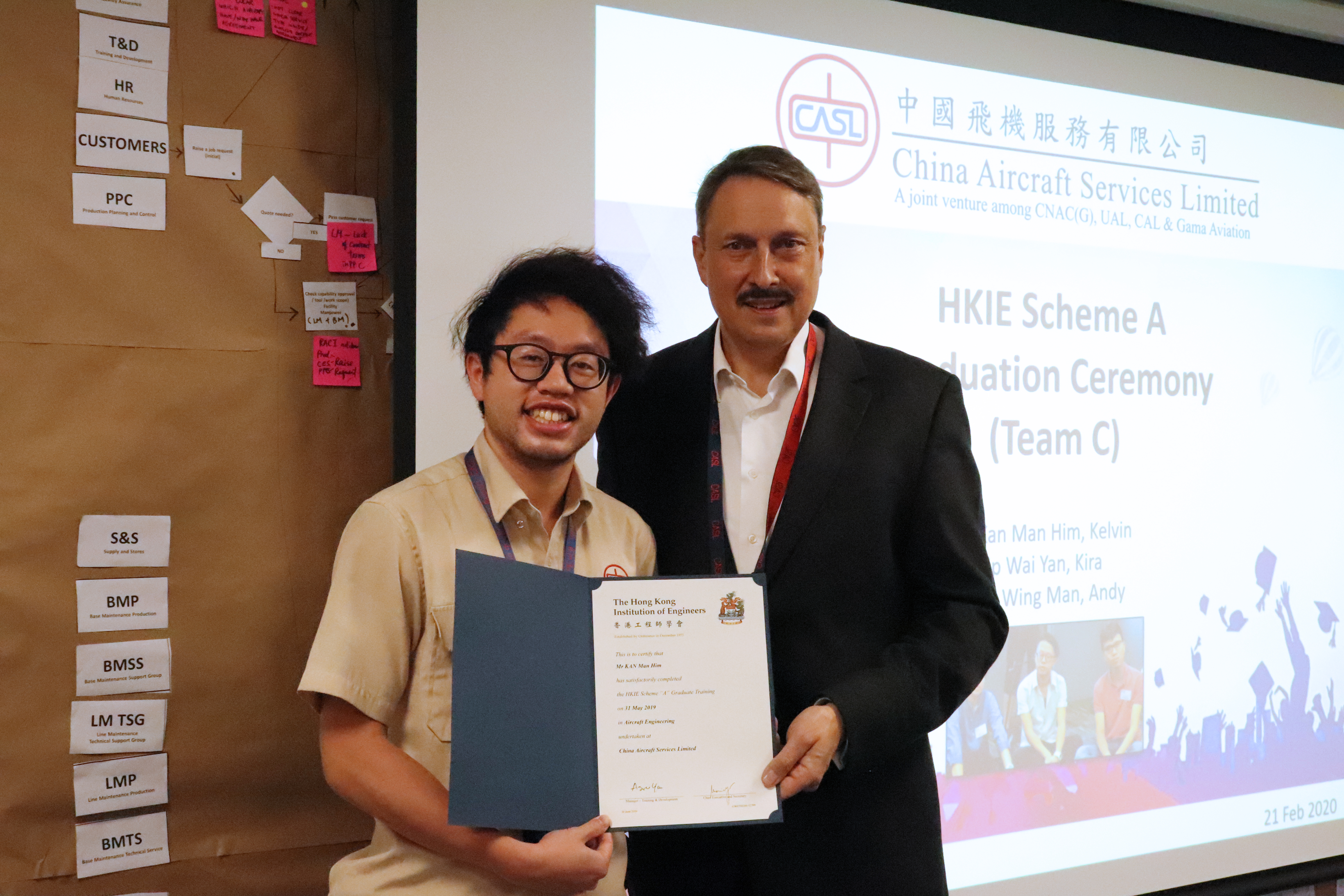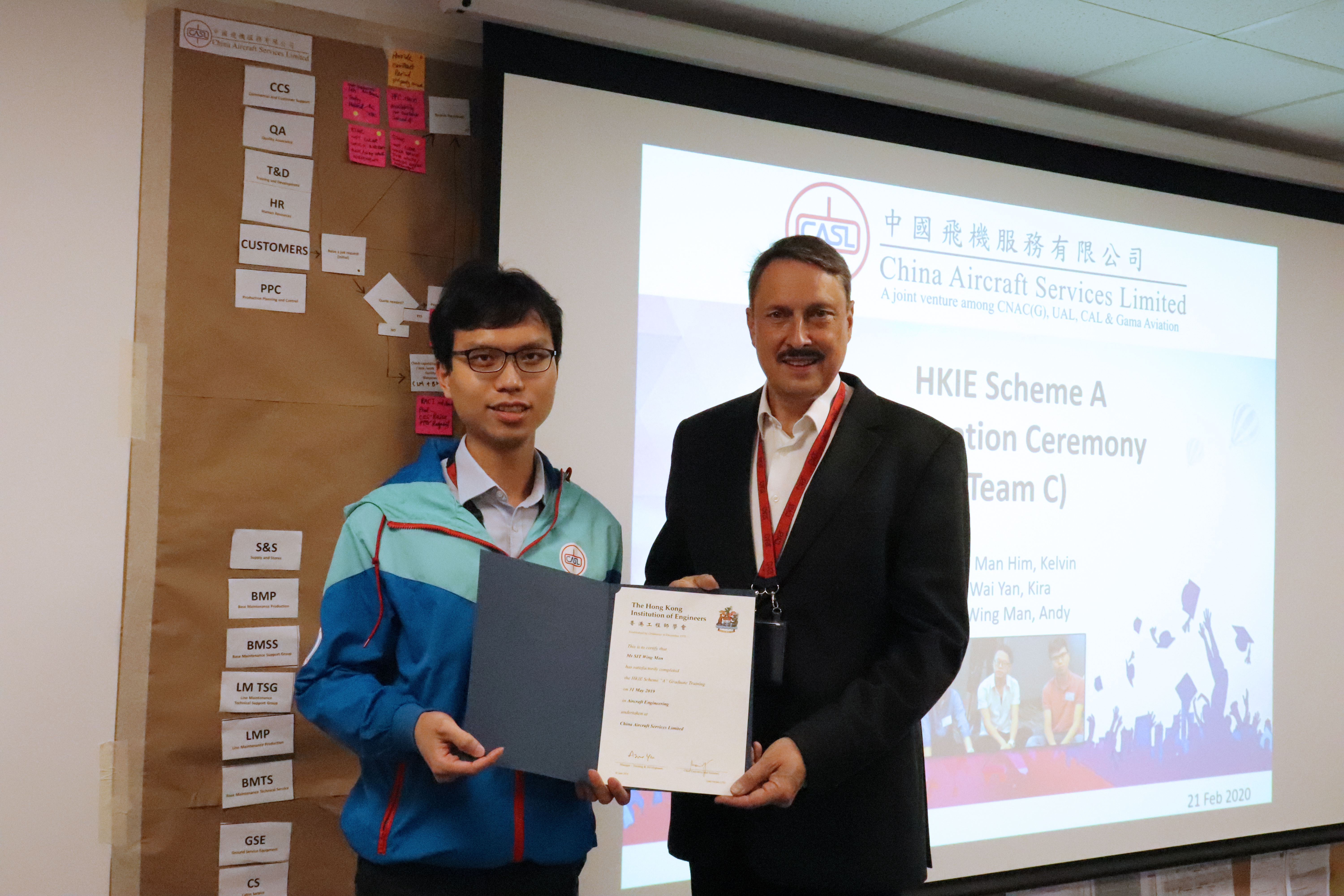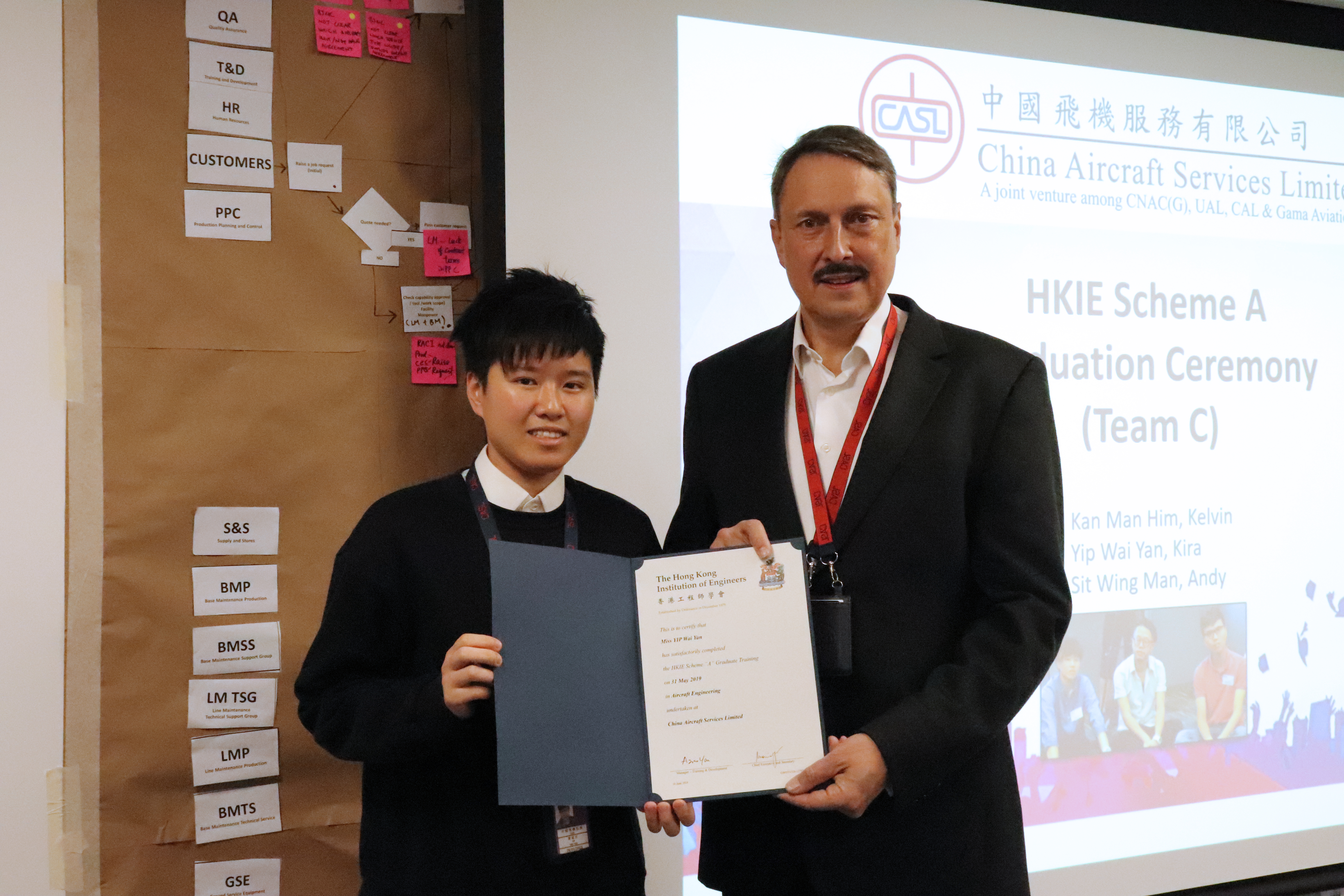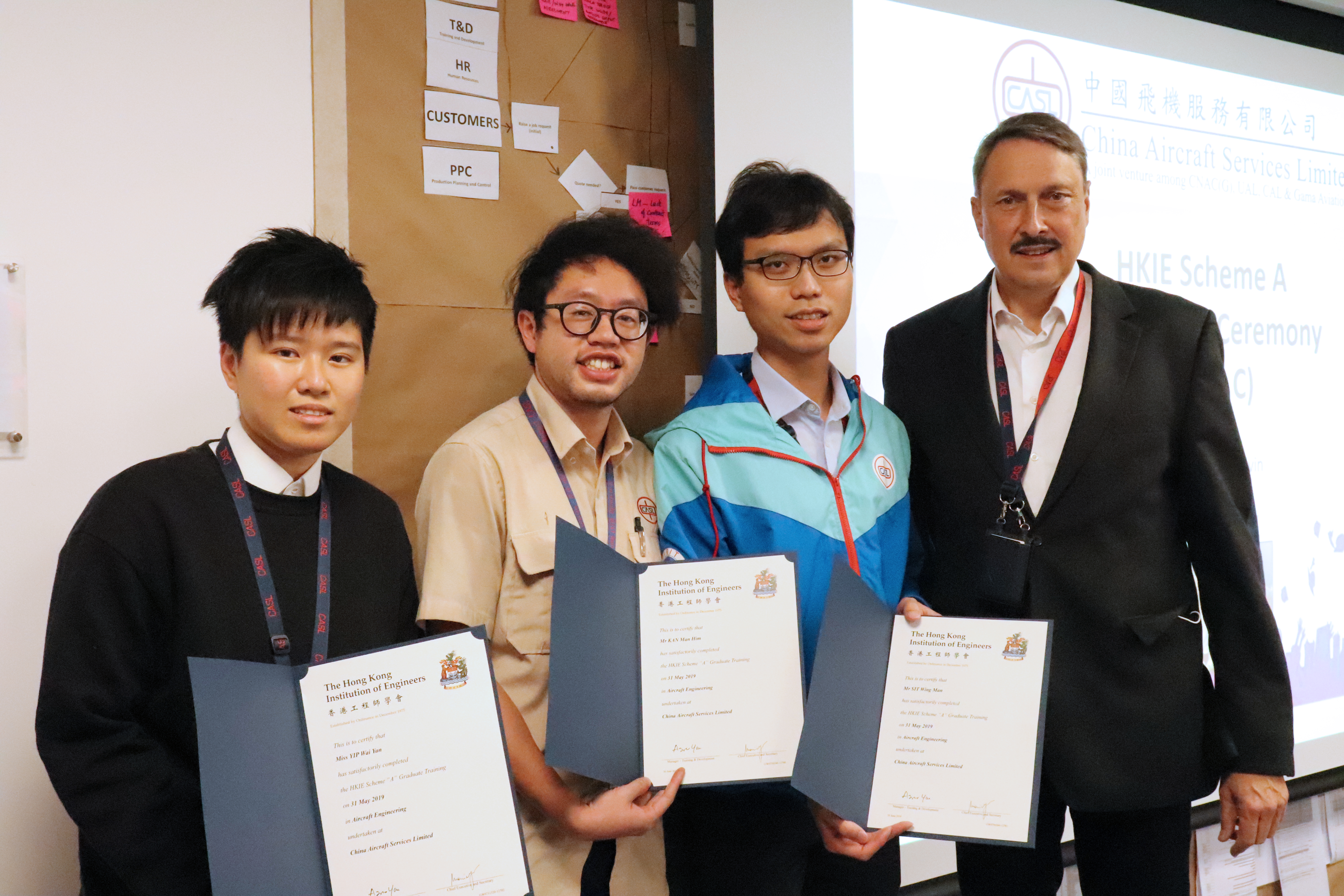 這是Kid、Kelvin和Andy的大日子!三位中飛工程師培訓生早前順利完成由中國飛機服務有限公司主辦、香港工程師學會協辦的飛機維修訓練課程。