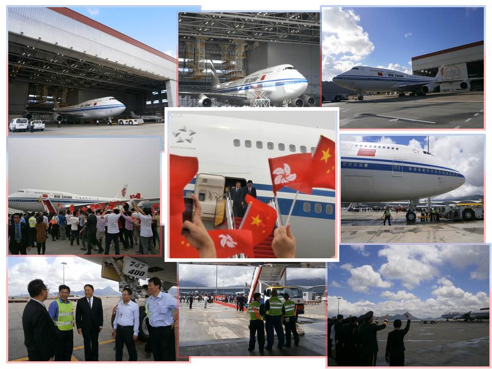 國家主席胡錦濤為慶祝香港特區政府成立15周年的三天訪港期間, 中國飛機服務有限公司(中飛公司)有幸成為這次國家專機在港服務團組之一,主要任務是協助國航的專機維修人員為專機提供地面保障和特種車輛等服務。
